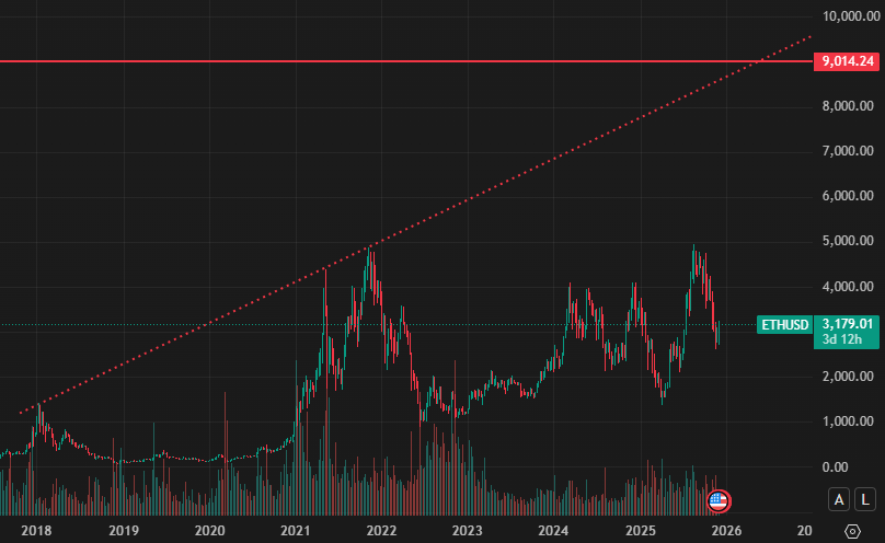 If it does rise to 0.056, it sets up a route all the way to 0.166. If BTC was at ~$40,000, ETH would be $6,640, BTC at $60k would put ETH at $9,960 and BTC at $80k would put ETH at $13,280. Although $9,000 would be in line with the long-term Ethereum top resistance line, as seen below.